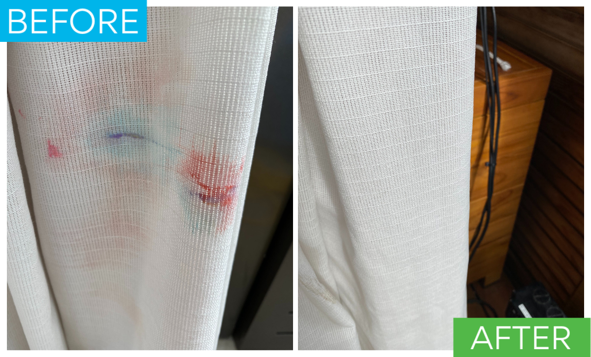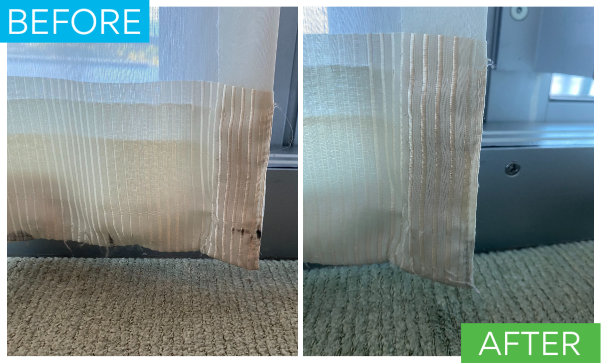 We start with testing to understand how the fabric responds to moisture and chemistry. From there we use a low moisture, drapery specific process aimed at lifting soil while minimizing risk of shrinkage, color loss, or distortion to ensure drapes hang and operate correctly.