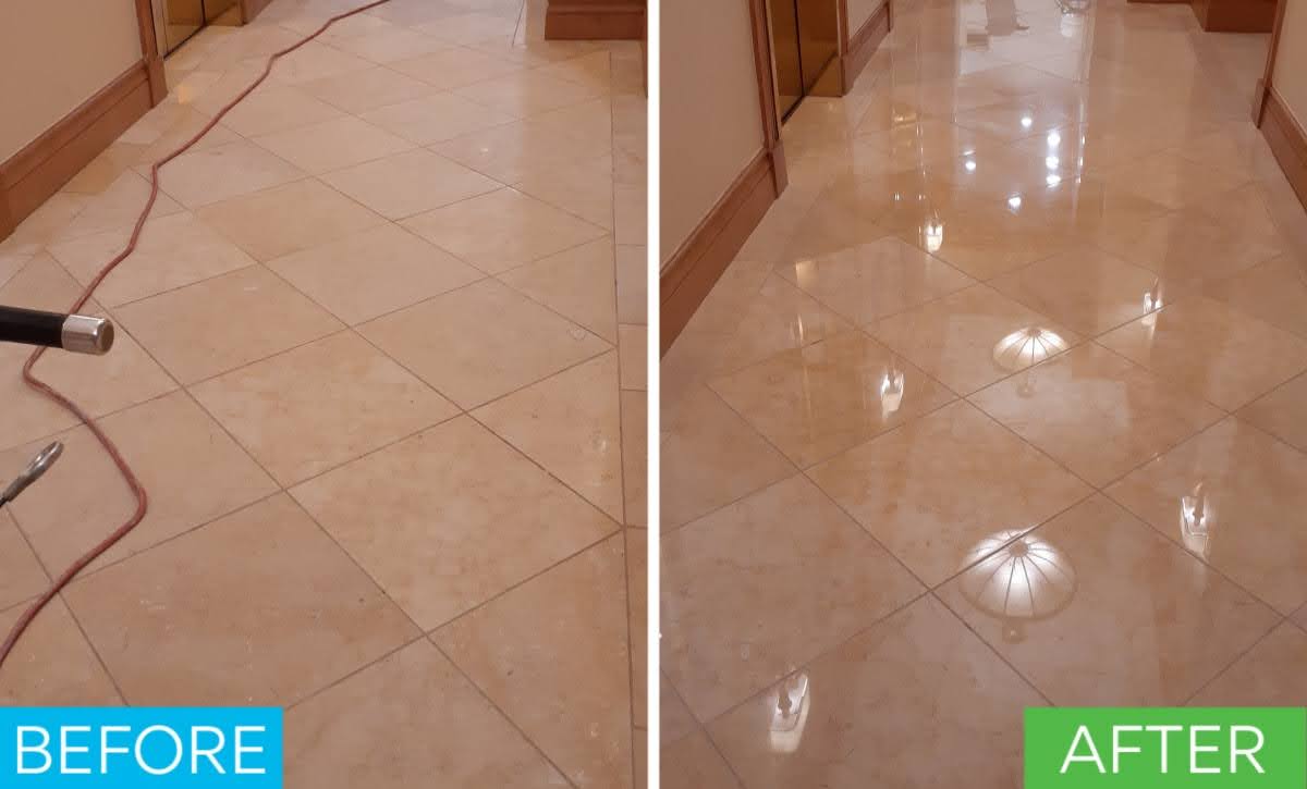 Cleaning removes surface soil and residue. Honing uses abrasives to remove etches, scratches, and wear, leaving a smooth, matte surface. Polishing takes the stone further to restore clarity and shine. In most hotels and condos we hone to remove damage, then polish to the gloss level that matches your design standards and slip requirements.